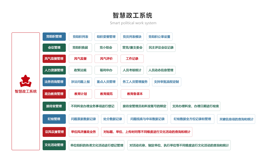 包含控制臺、組織架構、黨建動態(tài)、黨員學習、組織活動、志愿服務、黨費管理、監(jiān)督執(zhí)紀功能模塊。通過黨建在線學習教育,解決黨建學習難問題,實現便捷化管理;黨務工作流程及黨建資訊全掌握、黨建工作全方位可視,統一數據標準,智能分析績效考評,成績一目了然,做到數據指標化;積極推進黨建工作高效完成,信息高效處理。